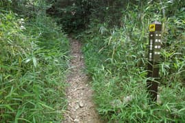 取り付き口から踏み跡を辿ると、すぐに天王吊橋の袂に着き、六甲全山縦走路に合流する。ここから縦走を再開。まず、鍋蓋山への急な登りにかかる。前回はこの急坂を見上げて、もう無理と思い、縦走を断念した。今日はもちろん元気なので楽勝だが、前回、もしここを登っていたら絶対力尽きただろうな、と思える急登が続く。