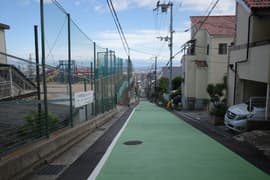 山麓に近づいて傾斜が緩む。最後の渡渉箇所は流れの細い所をジャンプ。この先で右に山寺尾根を経て摩耶山に直登するコースを分けると、右岸の高いところのトラバース道となり、程なく車道に出る。ちょうど学校が終わった時間帯らしく、グループでわいわい騒ぎながら下校中の中学生に混じって、住宅地の間の坂道を下る(カメラを向けて怪しまれてはいけないので、中学生は写真には映っていない😅)。