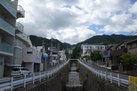 山麓の東西方向に延びる大通りに出、阪急六甲駅を目指して左(東)へ進む。途中、杣谷川を渡る橋から上流を眺めると、石組三面張りで急傾斜の水路が一直線に延びる。大雨の時の増水は凄そうだ。