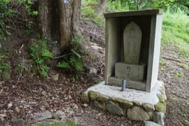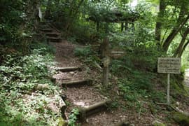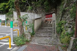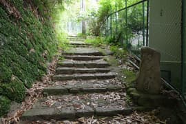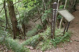 すぐに右に石段道が分岐し、「妙見宮参詣道」の石標がある。石段道の奥には「有馬三山 落葉山 灰形山 湯槽谷山」とデカデカと書かれた看板が見えている。ここが落葉山の登山口だ。石段道に入り、温泉街裏手の急斜面をジグザグに登る。参道に沿って西国三十三所観音の石仏が置かれ、台座に三番粉川寺、四番槙尾寺などと刻まれた石仏が順番に現れる。