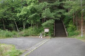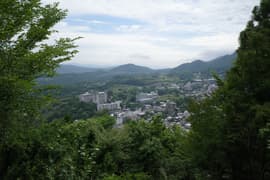 ようやく妙見寺境内に登り着き、平坦になって一息つく。ここは有馬温泉を俯瞰する眺めが良い。一対の狛馬の石像があり、台座には「有馬城山」「開運妙見宮」と刻まれている。