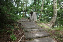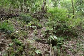 一旦車道に出、右手に有馬グランドホテルの庭園を見ながら登る。程なく車道は終点となり、2台分の駐車余地がある。ここから再び石段道に入り、路傍の石仏を数えながらジグザグに登る。急登に加えて、梅雨時らしい曇天で、日差しはないが湿度が高く、一汗かく。