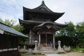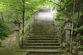 最後に参道石段を一直線に登ると、妙見寺の本堂が建つ頂上の境内に着く。境内は開けて明るいが、樹林に囲まれて展望はない。石畳の通路がまだ白くて新しい。本堂は二重屋根で、建築面積の割に高く見える。壁面や屋根下の木彫りの彫刻が見事だ。