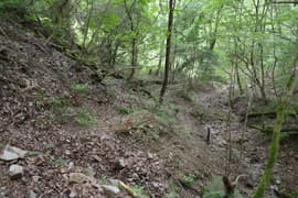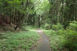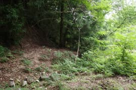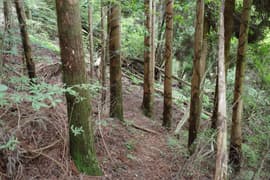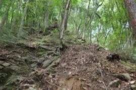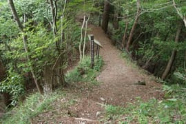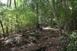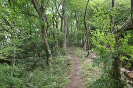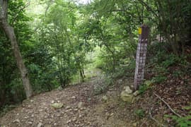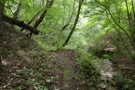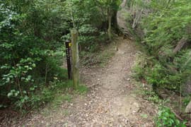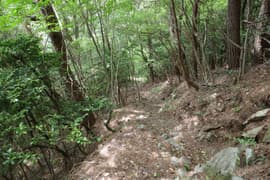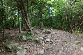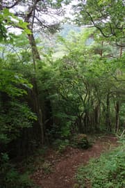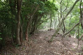 頂上を過ぎると緑滴る雑木林の下りとなる。「→高丸山尾根を経て有野団地4.2km」の道標があり、右に登山道を分ける。さらに少し下った鞍部で左に有馬温泉へ降りる道を分ける。鞍部からは、痩せ尾根を小さく上下する道がしばらく続く。