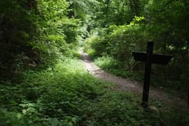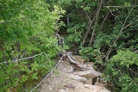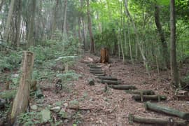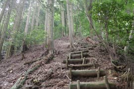 鞍部で左に有馬温泉への道を分け、湯槽谷山へ標高差約250mの登りに取り付く。杉と雑木に覆われた急斜面を階段道で一直線状に登る。時折、上空からカラカラと微かな音が響いてくるのは、六甲有馬ロープウェイが動いている音のようだ。