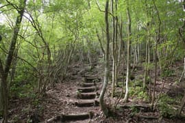 灰形山への登りに取り付くと、階段道を交えた急斜面の登りとなる。後ろから軽装のソロハイカーさんがハイペースでやってきて、小ピークに登り着いたところで追い抜かれる。灰形山まで0.1kmの道標があり、頂上はもうすぐだから、そこまで頑張ろう。