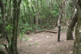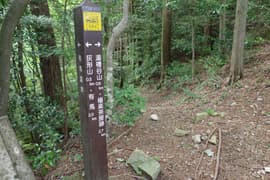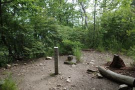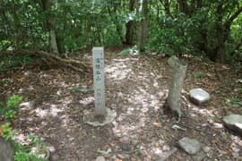 頂上はなだらかで樹林に覆われ、全く展望がない。ここにも御影石製の山名標柱がある。時間は早いが腹が減ったので、昼食休憩にしよう。平たい石に腰掛けてパンを食べて、ペットボトル飲料を飲む。食事中、ソロのトレイルランナーさんが通りがかって挨拶。アップダウンがきっつい、とおっしゃっていたが、そこを走るなんて凄い。