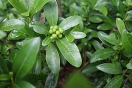 腹を満たしたのち、下山にかかる。尾根道を進んで緩く下る。左斜面には常緑樹のミヤマシキミが群生し、まだ緑色の実をつけている。