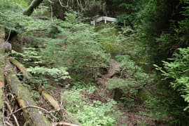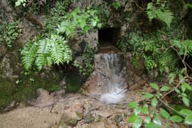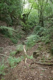 土石が押し出して伏流となり、荒れ気味の沢を下ると、石組みの砂防堰堤や三面張り工が現れる。いずれも古く小規模のもので、石組みは苔むしている。ガレ沢で踏み跡も定かでない。やがて水流が復活し、堰堤の下の水抜き穴からコンコンと湧き出ている。飲んでみたら冷たくて生き返る。まさに「六甲のおいしい水」だな。