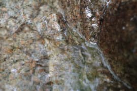少し傾斜が緩み、水が流れ出した沢に沿って下る。流れを覗き込むと、水底に小さくて茶色い生き物がいる。サンショウウオだ。これは初めて見た。手に掬って写真を撮りたかったが、逃げるし岩の溝にいるので掬い難く、何が写っているか不明な写真を撮って終了。