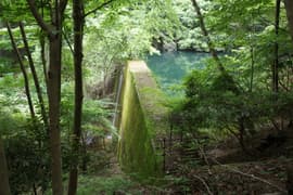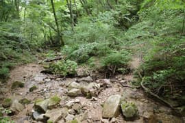 ガレて荒れた沢を下り、水流を何度も渡り返す。踏み跡が途切れる箇所もあり、ハイキングコースとしてはやはり難路。谷が広がって河原が現れると大きな砂防堰堤(湯槽谷第四砂防ダム、高さ20m)が現れ、その左脇を下る。さらに深緑色の水を満々と湛えた砂防ダムが連続し、左岸の杉林の踏み跡を辿って通過する。