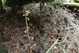 踏み跡を辿ると砂防堰堤上流の堆砂敷に降りる。はて、道はどこだろう、と見渡すと、堰堤を左から越える箇所に固定ロープがぶら下がっているのを見つける。ついでに変な植物も発見。これは出始めのツチアケビのようだ。熟すと赤茶のサヤエンドウのような実が鈴なりに成る。ガードレールも見えるので、車道が来ているのかと思ったが、ロープを手繰って登って見ると只のガードレールだった😅。