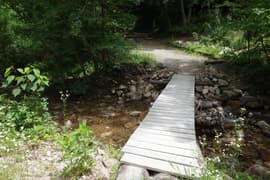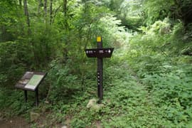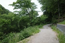 紅葉谷道は意外と幅が広く、平坦で歩き易い道だ。ところどころ簡易舗装が残る区間もある。木橋で渓流を渡ると右に炭屋道が分岐し、入り口に東屋が建つ。東屋で休憩していると、学生さんと思しきグループがワイワイ騒ぎながら紅葉谷道を登って行った。元気があって、大変よろしい。