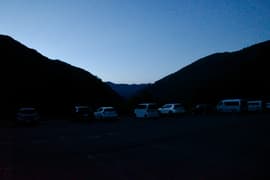 桐生を深夜に車で出発。関越道を水上ICで降りて土合に向かい、まだ暗いうちに谷川岳インフォメーションセンターのだだっ広い駐車場(無料)に車を置く。既に十数台の駐車があるが、キャパは余裕綽々。最初は車道歩きなので、ヘッドランプなしで歩き出す。
