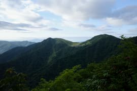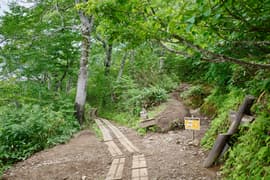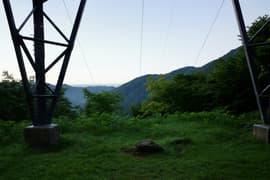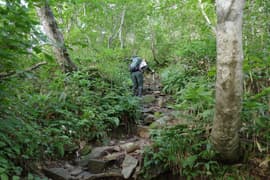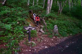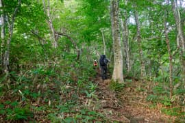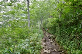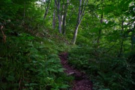 樹林帯を急登し、登山口から20分程で送電鉄塔に登り着く頃には、すっかり空が明るくなる。ここからは少し傾斜が緩み、ブナ等の樹林に覆われた尾根を一直線に登る。さらに約30分登ると樹林が切れたところがあり、行く手にラクダの背を仰ぐ。