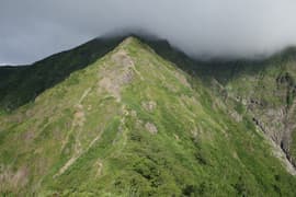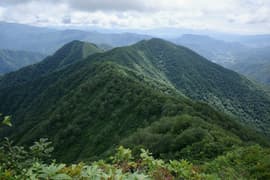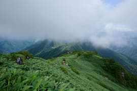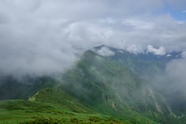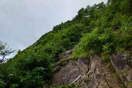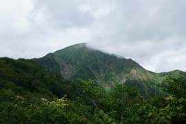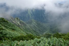 樹林帯に入り、熊穴沢避難小屋に着く。ここからは尾根を巻き、山腹をトラバースして進む。標高が1400mにさがり、風が通らないので蒸し暑い。天神峠へ登る道を右へ、その先で田尻尾根へ下る道を左に分ける。田尻尾根を下ってロープウェイ代1800円を浮かそうかとも思ったが、暑いし疲れているので、天神平へ直行する。樹林帯の切れ間からトマノ耳を振り返ると、灰色の雲がだいぶ広がっている。右に延びる西黒尾根はやはり急峻だ。