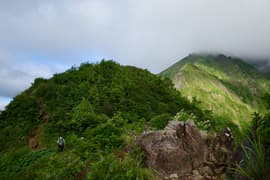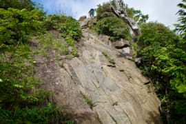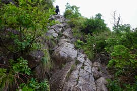 その後も一本調子の尾根道の登りが延々と続き、傾斜がだんだん増してくる。ようやく樹林帯から抜け、低木帯の岩尾根に出る。眺めが開けて休憩適地。一休みしたくなるが、もう少し頑張って、ラクダの背の頂上まで行ってしまおう。