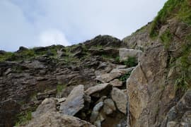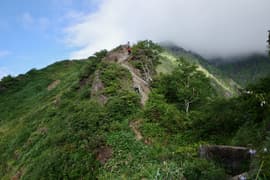 岩尾根を登ると鎖場が現れる。逆コースで下る場合は気が抜けない嫌な箇所だが、登りならばホールド、スタンスがあって、楽に登ることができる。鎖場を越えると西黒尾根の上部が見通せる、谷川岳の頂上稜線には雲がかかって、頂上は見えない。