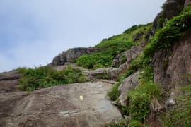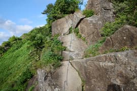 尾根を小さくアップダウンして進む。行く手には次の鎖場が現れ、先行するハイカーさんが取り付いているのが見える。この鎖場に着くと傾斜の強いつるつるな岩場で、鎖を手繰って腕力頼りで登る。さらに鎖場が続き、これを登り切るとようやくラクダの背の頂上に着く。いやー、疲れた。ここで大休止。
