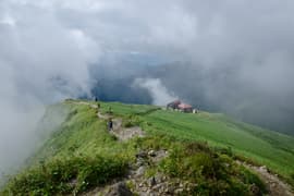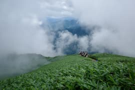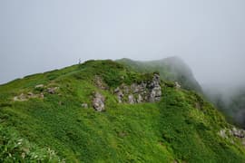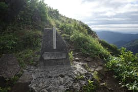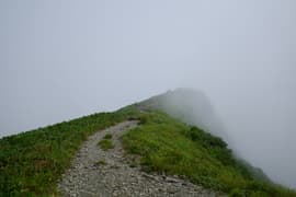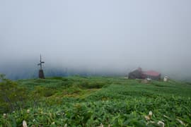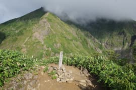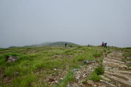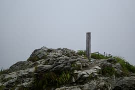 氷河の跡からひと登りするとようやく傾斜が緩み、ガスを透かしてトマノ耳の頂が見えてくる。肩ノ広場の大きな道標を過ぎ、笹原の緩斜面を登ってトマノ耳の頂上に着いた。