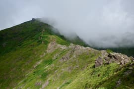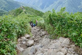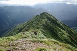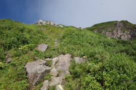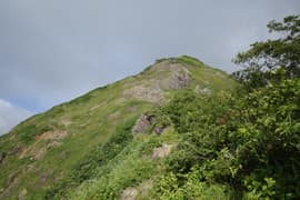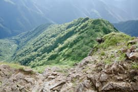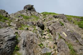 しばらく休んだのち出発。ラクダのコルへ緩く下り、マチガ沢から登って来た巌剛新道を合わせる。ここから岩場を交えた急坂を小さくジグザグを切りながらグングン登る。展望抜群。日差しを遮る木立がないので酷暑の夏にはつらい道だが、今日は頂上稜線に雲がかかる天気で、日が翳っているのが幸い。それでも急な登りで大汗をかく。振り返ればラクダの背が既に眼下で、一気に稼いだ高度を確認できる。