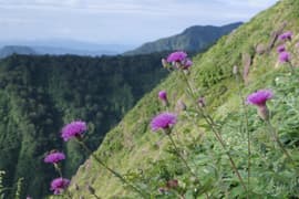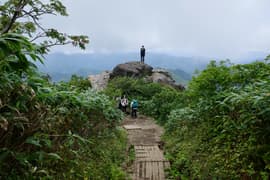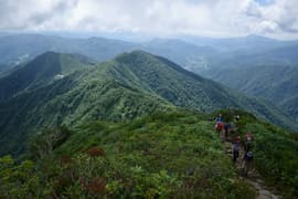 途中、雨粒がポツポツ落ちて来たが、すぐに止む。大勢のハイカーさんが憩う「天狗の留まり場」を通過し、天神平を俯瞰する見晴らしの良い尾根道を下る。下るに連れてハイカーさんの数も増えて、ひっきりなしにすれ違う。