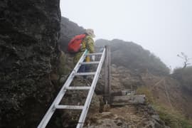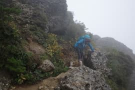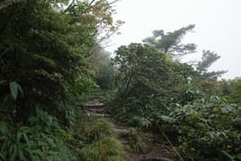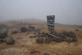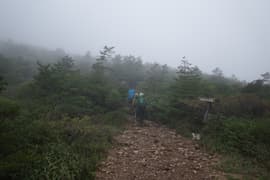 岩陰で風を避けて休憩し、お菓子を食べつつ、ガスが切れて展望が得られる機会を待つ。ほんの一瞬、頂上一帯のガスが上がって、船明神山の辺りが眺められたが、写真を撮る間もなくガスに閉ざされて見えなくなった。展望は諦めて、山頂の岩峰を降りる。
