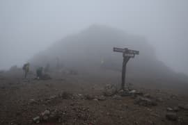 稜線上は強烈な風が吹き抜けて寒い。ヤマテンで気温10℃と予報していたが、体感はそれ以下だ。各自、防寒具(私はULDジャケット)を取り出して着込む。安達太良山の山頂部はポチッと飛び出たドーム状の岩峰で、ガスの中にボーっと霞んで浮かび上がる。