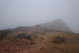 ガスの中、他のハイカーさんと前後して、五葉松平の緩斜面を登る。周囲の木々は薄らと赤や黄に色付き始めている。ユルユル登ると徐々に周囲の樹林が低くなり、高山的な雰囲気に。やがてガレた道の登りとなり、右に峰ノ辻経由くろがね小屋への道を分けると、程なく安達太良山の頂上稜線に登り着く。