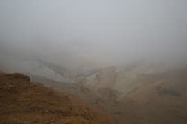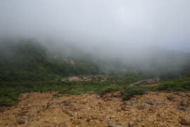 なだらかな稜線を進むと、安達太良山の爆裂火口の縁の牛ノ背と称する地点に着き、火口底の沼ノ平を見おろす。ガスで霞んでいるが硫黄の臭いが漂い、白や薄黄色、褐色の地肌が露出した火山地形が眺められる。これが見たかった。パーティ一同、奇観に感動する。