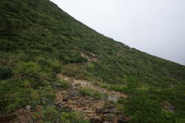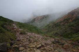 牛ノ背で稜線を離れて、くろがね小屋に向かう。少し下がるとガスが上がって周辺の景色が眺められる。赤褐色のザレに露岩と低木帯の緑が点在する斜面が広がり、浅い谷底には雨後の水が勢いよく流れ、庭園のような趣がある。やがて、平坦な尾根上に出ると峰ノ辻で、安達太良山の頂上直下からの登山道を合わせる。