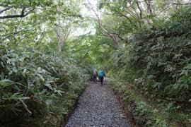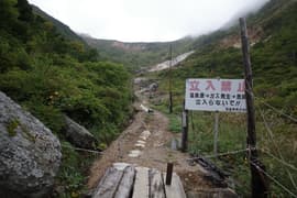 樹林の間の溝状の道を通って谷間に下る。左手には白く硫黄に覆われた斜面が現れ、「立入禁止 温泉原→ガス発生→危険 立ち入らないで!!」という看板の前を通って、くろがね小屋に到着する。周辺は硫黄の臭いが強い。小屋の中には人がいるが、工事関係者のようだ。小屋のWCは使用不可で、僅かに下ったところに携帯トイレブースが設置されている。前回もこの小屋を訪れているが、記憶が曖昧で、現在の様子とあまり重ならない。