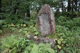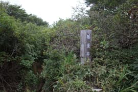 湯川の渓谷から離れ、台地上の広大な樹林を切り開いた作業道を辿る。途中、左の道端に「勢至塔」と刻まれた石碑が建つ。その先、5分程のところに「勢至平」の道標があり、右に山道らしきものが分岐するが、強烈に灌木藪っぽい。