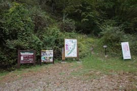上空には依然として雲が広がり、車から外に出ると空気がヒンヤリと湿って冷たい。登山口には「滝見の湯」、中嶋豊氏作成のイラストマップのほか、クマ出没注意(今年6月に目撃情報あり)の看板がある。熊鈴を付けて歩き出す。