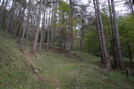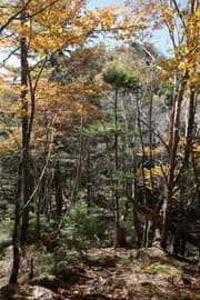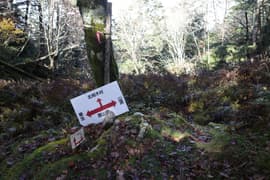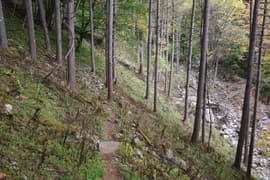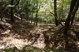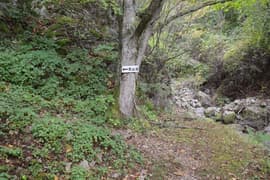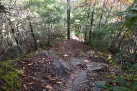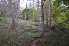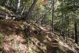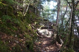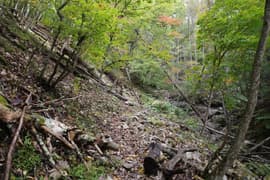 登山道は山腹をジグザグに登り、右岸の斜面をトラバースして進む。唐松林の中の作業道跡をしばらく辿り、道標に導かれて左の山道に入る。周囲の木の葉は赤や黄に仄かに色付き始め、行く手には木立を透かして、これから登る急な山肌が霧を纏って垣間見える。深山幽谷の雰囲気があって、なかなか良い。