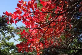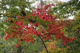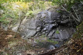 さらに鎖場を下り、急斜面をジグザグに下って不動の滝に着く。日が差し込んで、滝身や周囲の紅葉を明るく照らし出す。滝からは沢の右岸の斜面の道をのんびり下って、栗生登山口に帰り着く。駐車が7台程に増えていて、駐車スペースから溢れた車は道幅の広い所に置かれていた。