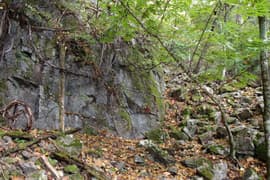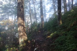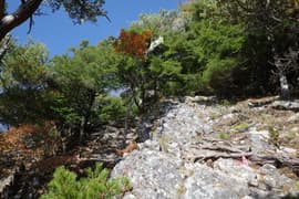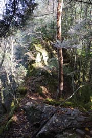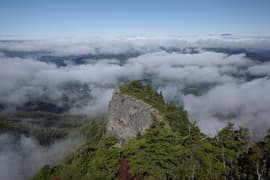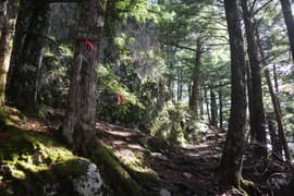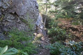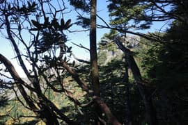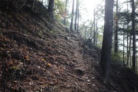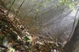 登山道は不動の滝から沢を離れて、左岸の急斜面をジグザグに登る。雲の中に入ったのか霧が流れて来て、木漏れ日が霧をスクリーンにして明暗の縞模様をつくる。風が出てきて、少し肌寒い。急斜面の登りが続き、やがて、雲を抜けたのか霧が消え、鬱蒼と茂る針葉樹林帯に入る。「山頂まで500m」の標識が現れ、その背後には大きな岩壁が聳り立つ。