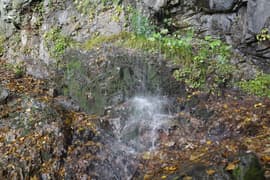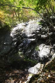 やがて左手に大岩壁が現れ、その基部を登ると不動の滝が現れる。オーバーハングした岩壁から細々と水を落とす滝で、落差は10mくらいか。見えている落口の上にも急傾斜のナメが続いているようで、全体では結構な落差がありそう。なかなか見応えのある滝だ。
