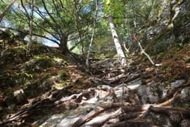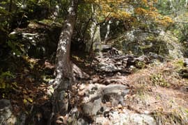 やがて山道は土石に埋もれた唐沢に近づき、ガレ沢に沿って登る。この沢の荒れ様は2019年10月の台風19号の爪痕だそうである。沢沿いの登山道が崩落したため、しばらく通行止めとなり、2020年11月に迂回路の整備が完了して、通行止めが解除されたとのこと。