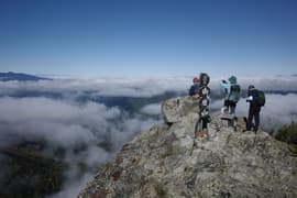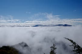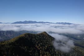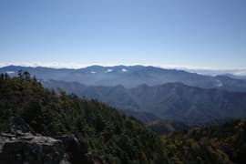 雲が徐々に消えていき、北方を望むと北アの槍ヶ岳や鹿島槍、白馬岳などの頂が雲海の彼方に現れる。圧巻は八ヶ岳連峰の展望で、権現岳から赤岳、天狗岳、蓼科山まで主稜線のピークがズズズイーッと一望できる。