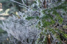 さらに鎖が張られた岩稜を登ると傾斜が緩み、針葉樹林に入って小尾根を登る。反対側の谷から寒風が吹き上がり、葉や小枝には霧氷が着いていて、思わずムッヒョーと声が出る。木立を透かすと、御座山頂上部の壮大な岩壁が垣間見える。木が邪魔で、すっきり眺められないのが惜しい。