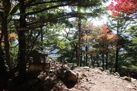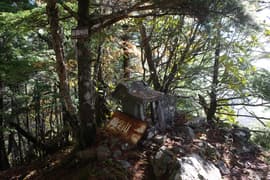 やがて、小広い平地と石祠のある小ピークに登り着く。山と高原地図に「御岳神社」の記載があるピークで、現地には「前御座山2050m」の古い山名標識もある。ここで一休み。