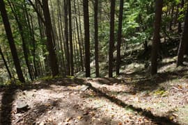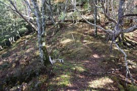御岳神社からは短い急坂を下り、小さな岩稜を通過。鎖のある岩場を下ると、左側の樹林が開けて明るい鞍部(金山沢のコル)に着く。道標があり、左に北相木村の山口登山口への道を分ける。そちら方面の下り口はシダと草に覆われて、歩く人が少ない様子。しかし、途中には御座山頂上部の岩稜が良く見える箇所があるかも。ちょっと興味が湧く。