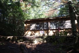 鞍部から登り返し、岩壁の基部を通過してひと登りすると避難小屋があり、白岩登山口からの登山道を右から合わせる。小屋内部を覗くと綺麗な板間があり、快適に泊まれそう。