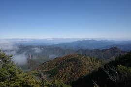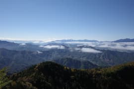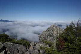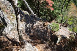 岩壁の基部を右へ回り込むと長い鎖場が現れる。木の根、岩角が利用でき、楽に登ることができる。さらにもう一段、鎖場を登ると見晴らしの良い小平地に出て、雲海の向こうに奥秩父の金峰山辺りの山影を遠望する。青空が広がり、雲は徐々に消えつつある。