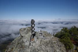 小屋の左へ進むとすぐに頂上岩稜の上に出、展望が一気に開けて感動する。岩稜の少し先に山名標識が建っているのが見える。あそこが頂上だ。岩稜の上を慎重に渡って頂上に向かう。左側は大岩壁となってすっぱり切れ落ち、覗き込むと恐ろしい程の高さがある。