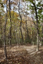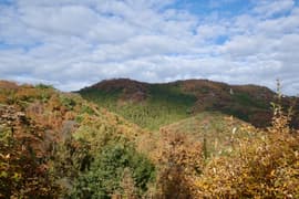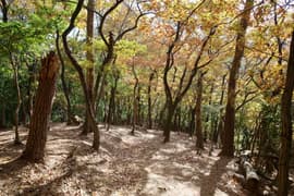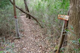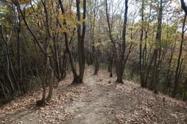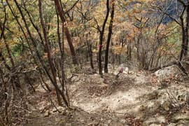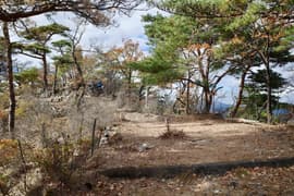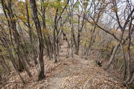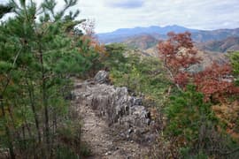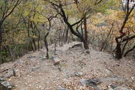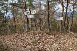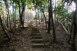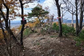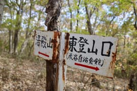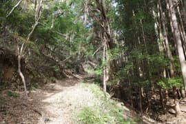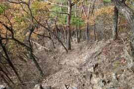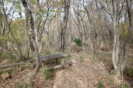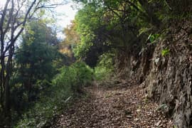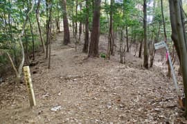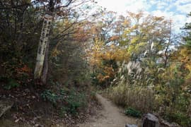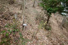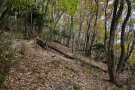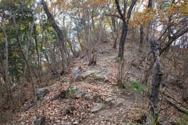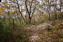 登山口から作業道跡に入り、小さな谷に沿って登る。谷の途中で左に切り返し、山腹を削ったトラバース道となる。薄らと黄葉した枯れ色の雑木林に入ると尾根の上に出て、以前の東登山口からの登山道(廃道)と合流する。ここには小さなベンチが3台ある。