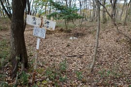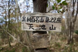 ここから、スズタケがぽさぽさと生えた雑木林の尾根道となる。ゆるゆると登っていくと、途中、急坂も交えて、天池山の平坦な頂上に着く。前回の登頂時にはなかった「足利百名山第22座天池山」の山名標識をゲット。すぐ先の天池(猪の楽園)は大きなヌタ場で、中央に泥水が僅かに溜まり、掘り返された跡がある。前回は、天池は密な笹藪に覆われて、登山道からは良く見えなかった。各地でスズタケが減少しているという話を聞くが、ここでも減少しているようだ。