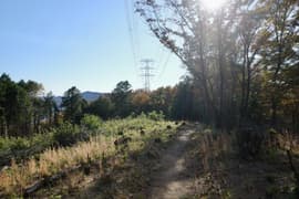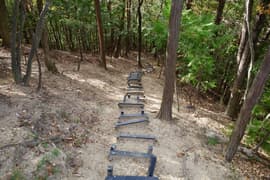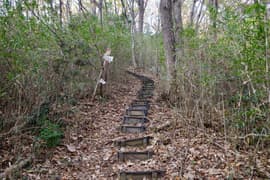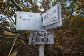 ザレて滑り易い急坂が終わり、ようやく平坦な尾根となって、のんびり歩く。左に中山駐車場へ下る道を分けると、プラ階段の登りとなる。プラ階段の途中に「足利百名山第108座鉄塔山」の標識があり、右に登山道を分ける。