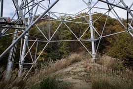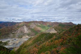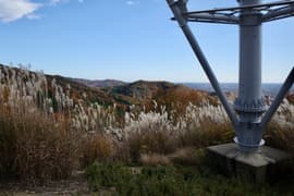 プラ階段を登ると、すぐに巨大な送電鉄塔の建つ頂に着く。「鉄塔山」とは味も素っ気もないネーミングだが、頂上からの眺めはまあまあ。振り返ると、白雲を浮かべた青空を背景にして湯殿山の頂上稜線が眺められ、晩秋らしい良い景色だ。
